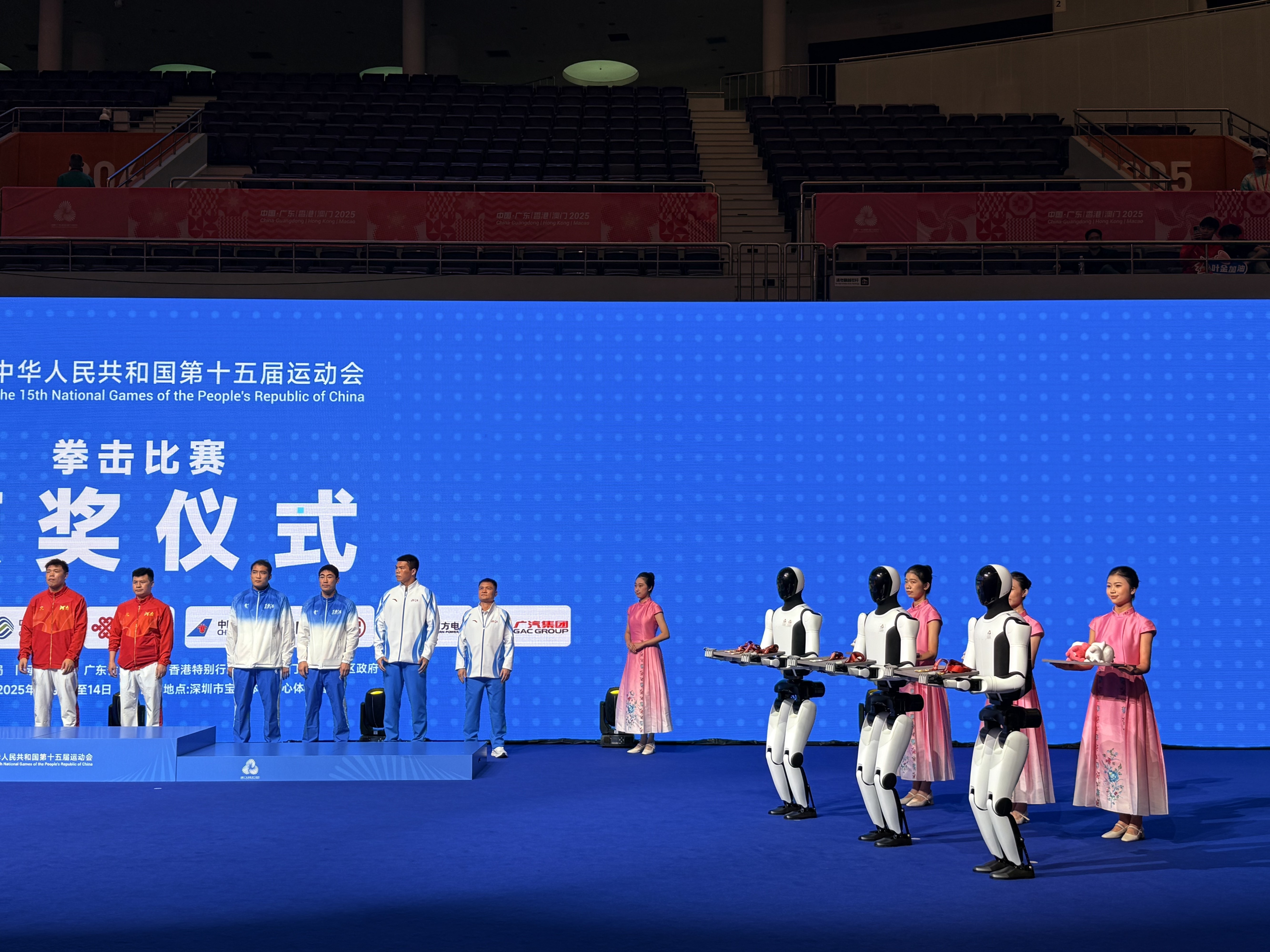 当天的拳击赛事最后一场颁奖仪式上,一幕科技与体育交融的画面格外吸睛:三台深圳本土研发的智能机器人“化身”礼仪人员,迈着精准步伐走近颁奖台,稳稳为颁奖嘉宾递上奖牌。
